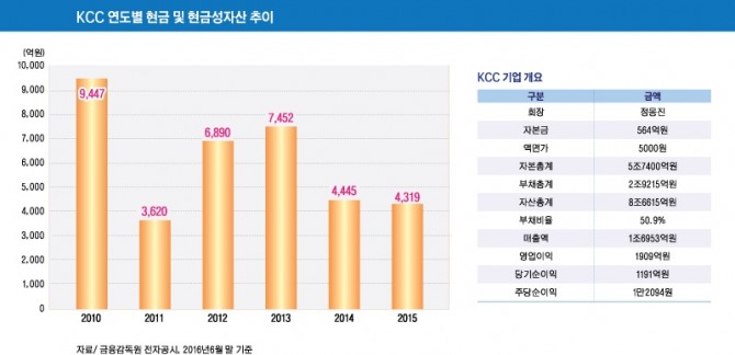 KCC는 지난 2011년 현금 및 현금성자산이 9447억원에서, 2012년 3620억원, 2013년 6890억원, 2014년 7452억원, 2015년 4445억원으로 줄어들고 있는 추세다.