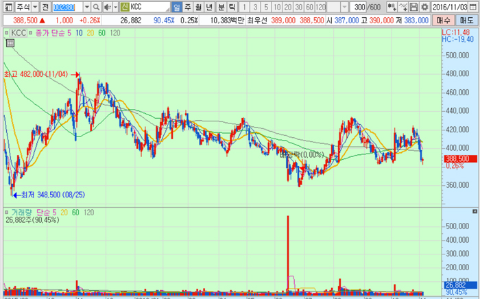 KCC의 주가는 3일 종가 38만8500원으로 지난해 11월 4일 고점 48만2000원에 비해 19.4% 하락한 수준에서 거래되고 있다.