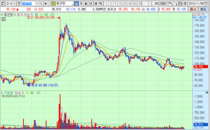 종근당의 주가는 4일 종가 9만5100원으로 올해 1월 8일 고점 18만6000원에 비해 48.9% 하락한 수준에서 거래되고 있다.