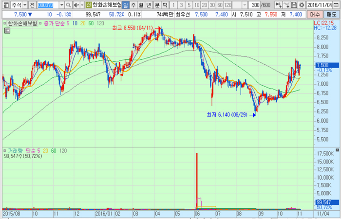 한화손해보험의 주가는 4일 종가 7500원으로 올해 8월 29일 저점 6140원에 비해 22.1% 오른 수준에서 거래되고 있다.