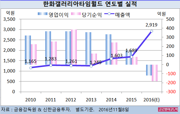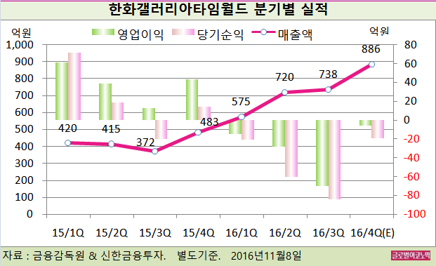 한화갤러리아타임월드는 애널리스트들로부터 신성장엔진을 구축하게 됐다며 2016년 이후 실적 고성장이 예상된다고 호평을 받았지만 올해 3분기 실적은 초라하기만 하다.