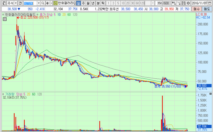 한화갤러리아타임월드의 주가는 7일 종가 3만8500원으로 지난해 7월 17일 고점 22만500원에 비해 82.6% 하락한 수준에서 거래되고 있다.