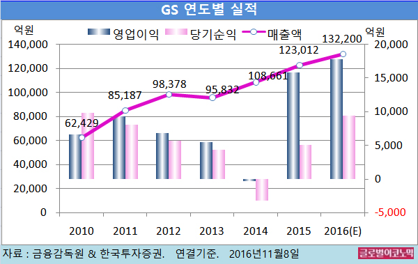 이 연구원은 GS의 올해 연결기준 매출액이 13조2200억원(전년비 +7.5%), 영업이익 1조7790억원(전년비 +12.5%), 당기순이익 9430억원(전년비 85.2%)에 이를 것으로 전망하고 있다.