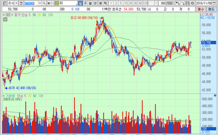 GS의 주가는 7일 종가 5만3700원으로 올해 4월 14일의 고점 6만원에서 10.5% 하락한 수준에서 거래되고 있다.