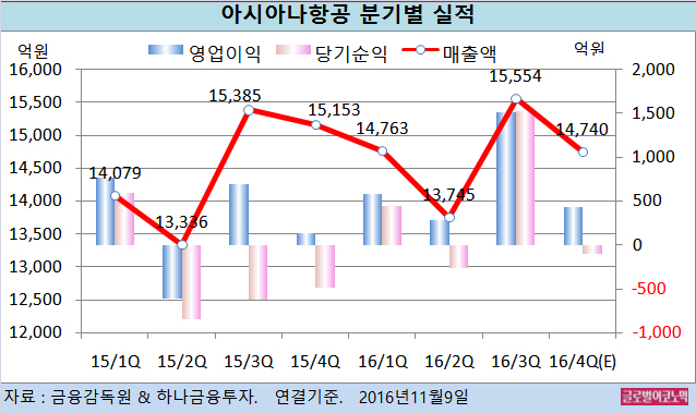 하나금융투자 신민석 연구원은 아시아나항공의 3분기 영업이익이 시장 예상치를 상회한 1516억원을 보여다고 평했다.