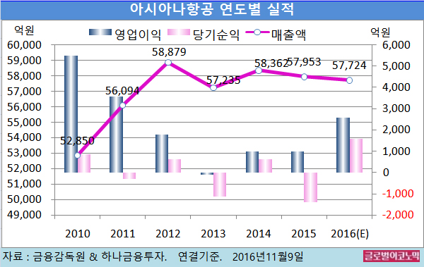 아시아나항공은 단거리노선 비중이 높아 저비용항공사와의 경쟁심화로 지난 2013년 이후 부진한 실적을 기록해왔다.