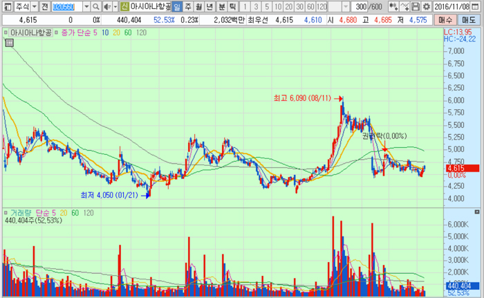 아시아나항공의 주가는 8일 종가 4615원으로 올해 8월 11일의 고점 6090원에 비해 24.2% 하락한 수준에서 거래되고 있다.
