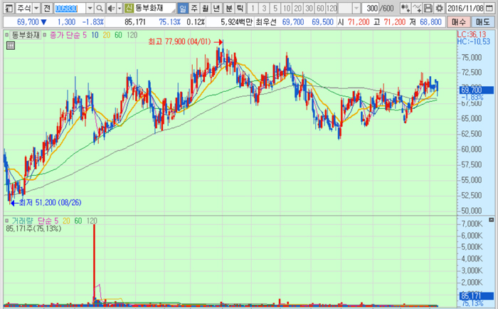 동부화재의 주가는 8일 종가 6만9700원으로 지난해 8월 26일의 저점 5만1200원에 비해 36.1% 오른 수준에서 거래되고 있다.