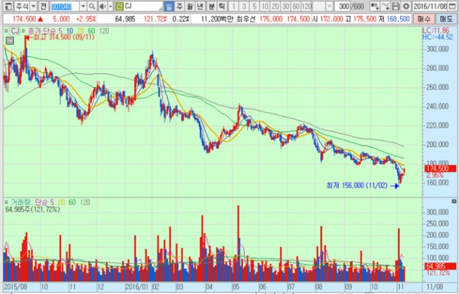 CJ 주가의 경우 8일 종가 17만4500원으로 지난해 9월 11일의 고점 31만4500원에 비해 44.5% 하락한 수준에서 거래되고 있다.