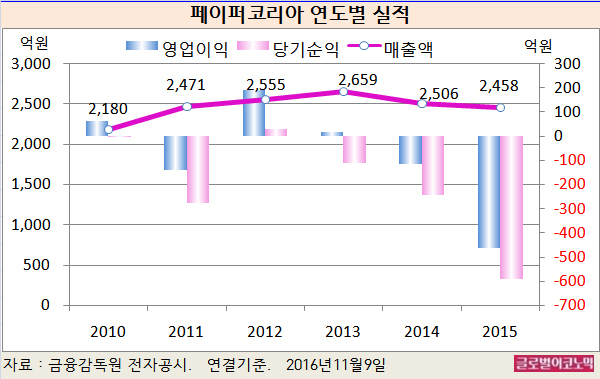 페이퍼코리아의 2015년 연결기준 매출액은 2458억원(전년비 -1.9%), 영업이익 -464억원(적자지속), 당기순이익 -593억원(적자지속)을 기록했다.