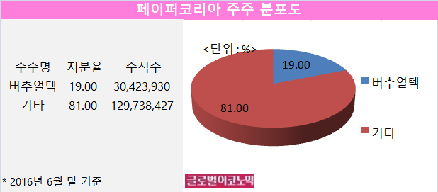 페이퍼코리아의 최대주주는 올해 6월 말 현재 지분 19.0%(3042만3930주)을 갖고 있는 버추얼텍이다. 버추얼텍은 1994년 7월 28일에 설립되어 S/W 개발, 고지 수입 및 판매, 통신장비 제조사업 등을 영위하고 있다.