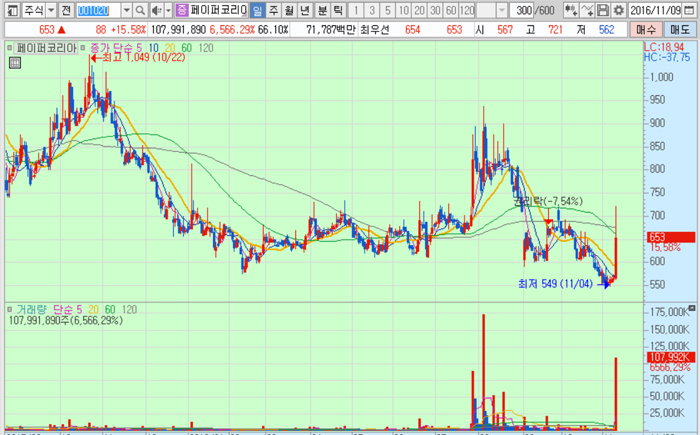 페이퍼코리아는 이날 종가가 전일보다 88원(15.58%) 오른 653원으로 올해 11월 4일의 저점 549원에 비해 18.9% 상승한 수준에서 거래됐다.