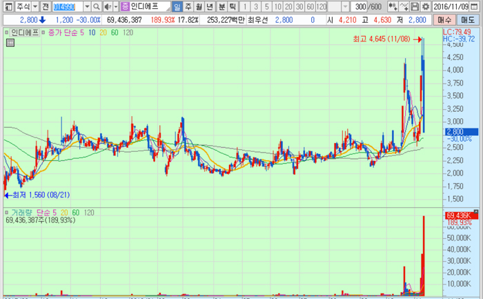 인디에프는 클린턴 수혜주로 부각되면서 주가가 급등했으나 9일 클린턴의 패색이 짙어져가면서 하한가로 추락했다.