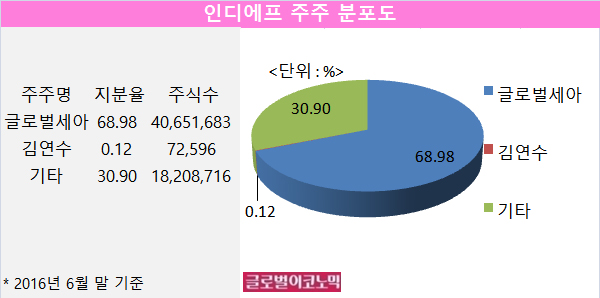 올해 6월 말 현재 인디에프의 최상위지배회사는 글로벌세아㈜로 되어 있고 글로벌세아는 인디에프의 주식 68.98%인 4065만1683주를 보유하고 있다. 김연수 사외이사가 지분 0.12%인 7만2596주를 갖고 있다.