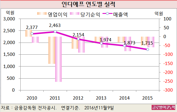 인디에프는 지난 2010년부터 2015년까지 당기순이익이 적자를 보이고 있다. 영업이익은 2011년부터 적자를 지속하고 있다.
