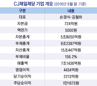 CJ제일제당은 올 상반기 주당순이익(EPS)이 1만1673원으로 나타났다. CJ제일제당의 주가는 36만6000원을 오르내리고 있어 주가수익비율(PER)은 약 16배에 달한다.