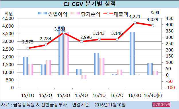 신한금융투자 성준원 연구원은 CJ CGV의 영업이익이 추정치 329억원을 소폭 상회했지만 시장 컨센서스인 378억원 보다는 낮았다고 평했다.