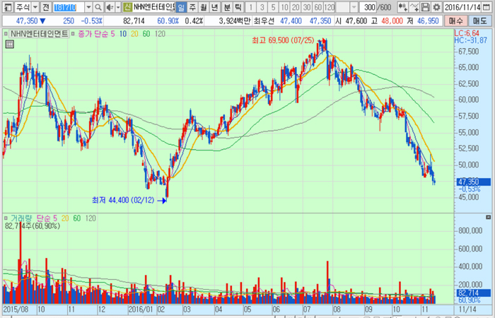 NHN엔터테인먼트의 주가는 14일 종가 4만7350원으로 올해 7월 25일 고점인 6만9500원에 비해 31.9% 하락한 수준에서 거래되고 있다.