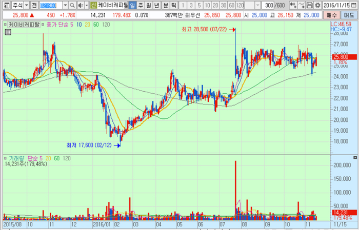 케이비캐피탈의 주가는 15일 종가 2만5800원으로 올해 2월 12일의 저점 1만7600원에 비해 46.6% 높은 수준에서 거래되고 있다.