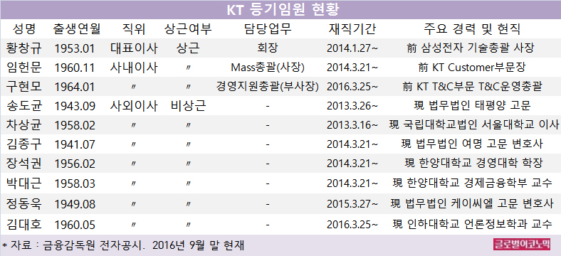 사내이사는 황창규 대표이사 회장, 임헌문 Mass총괄 사장, 구현모 경영지원총괄 부사장으로 되어 있다.