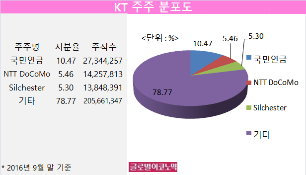 KT의 최대주주는 지분 10.47%(2734만4257주)를 갖고 있는 국민연금이다. 때문에 주인이 없는 회사라는 성격 탓으로 정치권의 낙하산 인사를 비롯해 비선실세들의 ‘먹이감’이 되곤 했다.