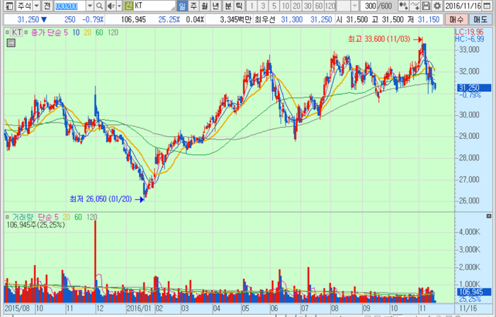 KT의 주가는 16일 오전 11시 25분 현재 3만1250원으로 올해 1월 20일의 저점 2만6050원에 비해 20.0% 오른 수준에서 거래되고 있다.