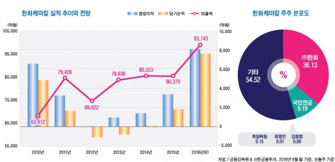 이 연구원은 한화케미칼의 올해 연결기준 매출액이 9조3743억원(전년비 +16.6%), 영업이익 8076억원(전년비 +139.6%), 당기순이익 7597억원(전년비 +321.1%)에 이를 것으로 내다보고 있다.