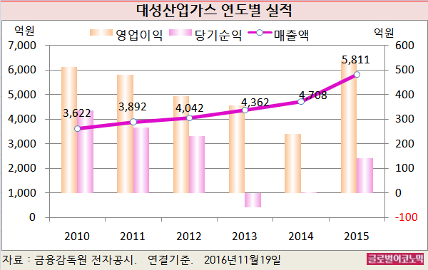 대성산업가스의 지난해 연결기준 매출액은 5811억원, 영업이익 539억원, 당기순이익 142억원으로 나타났다.