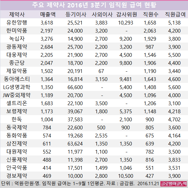 글로벌이코노믹이 21일 주요 20개 제약사의 9월 분기보고서를 분석한 자료에 따르면 이들 회사의 임원 급여는 총 51억144만원으로 1인 평균 2억5507만원에 달한 것으로 집계됐다.