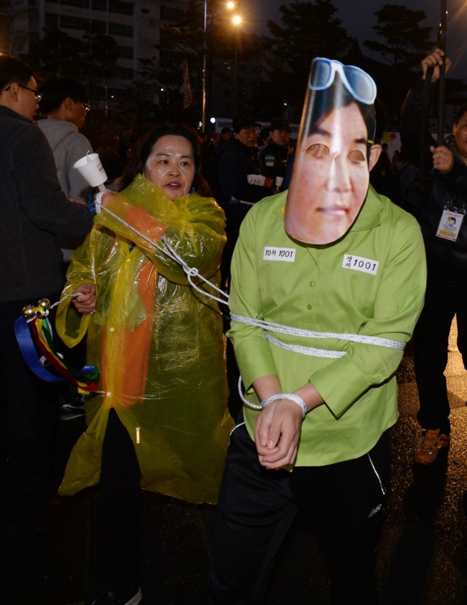 한쪽에는 최순실 씨를 비롯해 김기춘 전 청와대 비서실장, 우병우 전 청와대 민정수석, 새누리당 이정현 대표 등을 배경으로 박 대통령을 무당으로 표현한 그림이 광장 한쪽을 차지했다.