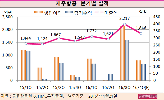 HMC투자증권 윤소정 연구원은 제주항공의 3분기 매출액과 영업이익이 추정치 대비 각각 5.2%, 1.3%, 시장 컨센서스 대비 6.6%, 8.8% 상회하는 사상최대 실적을 시현했다고 평했다.