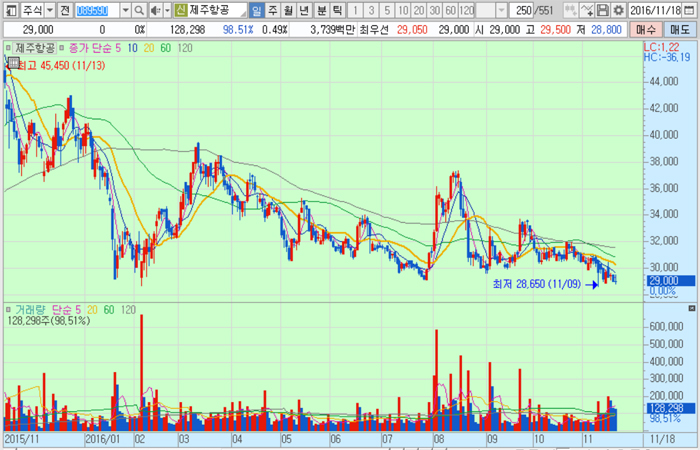 제주항공의 주가는 18일 종가 2만9000원으로 지난해 11월 13일의 고점 4만5450원에 비해 36.2% 낮은 가격에서 거래되고 있다.