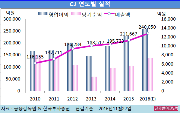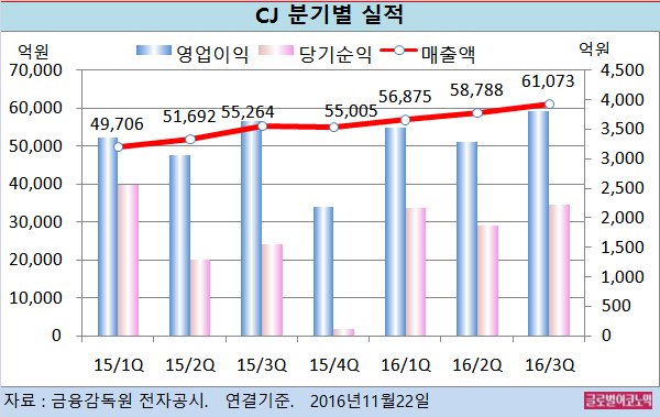 한국투자증권 윤태호 연구원은 CJ의 3분기 영업이익이 기대치에 부합했고 지배주주 순이익은 우리 기대치를 큰 폭 상회했다고 평가했다.