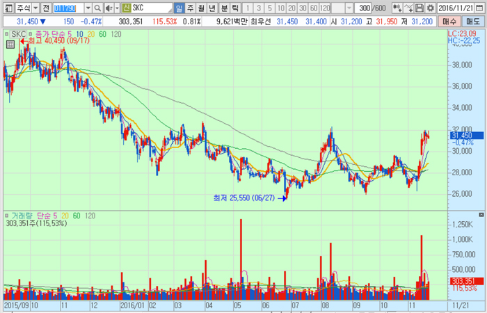 SKC의 주가는 21일 종가 3만1450원으로 지난해 9월 17일의 고점 4만450원에 비해 22.2% 하락한 수준에서 거래되고 있다.