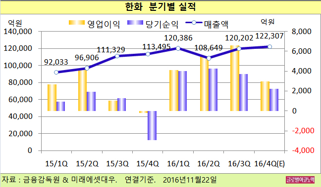 정 연구원은 한화의 올 4분기 연결기준 매출액이 12조2307억원(전년동기비 +7.8%), 영업이익 2995억원(흑자전환), 당기순이익 2224억원(흑자전환)을 기록할 것으로 내다보고 있다.