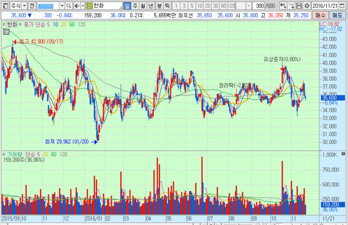 한화의 주가는 21일 종가 3만5600원으로 올해 1월 20일의 저점 2만9962원에 비해 18.8% 오른 수준에서 거래되고 있다.