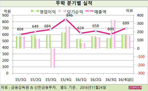 오 연구원은 무학의 올 4분기 별도기준 매출액이 699억원(전년동기비 -17.3%), 영업이익 165억원(전년동기비 -14.8%), 당기순이익 155억원(전년동기비 -41.7%)을 기록할 것으로 내다보고 있다.