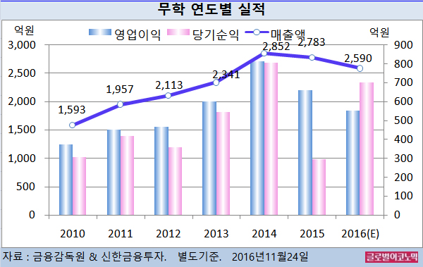 오 연구원은 무학의 별도기준 올해 매출액이 2590억원(전년비 -6.9%), 영업이익 552억원(전년비 -16.6%), 당기순이익 702억원(전년비 +138.8%)에 이를 것으로 전망하고 있다.