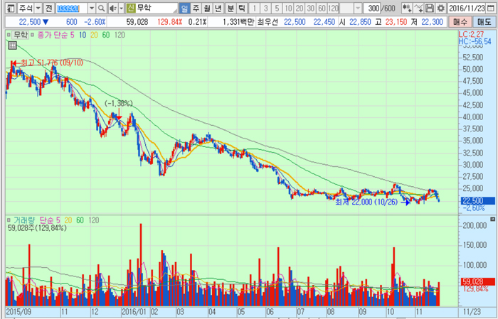 무학의 주가는 23일 종가 2만2500원으로 지난해 9월 10일의 고점 5만1776원에 비해 56.5% 하락한 수준에서 거래되고 있다.