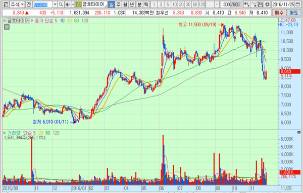 금호타이어의 주가는 25일 종가 8840원으로 올해 9월 19일의 고점 1만1500원에 비해 23.1% 하락한 수준에서 거래되고 있다.