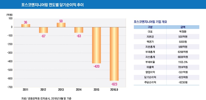 포스코엔지니어링의 최근 당기순이익을 보면 연결기준 2013년 50억원, 2014년 -63억원, 2015년 -420억원을 기록했다.