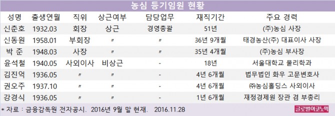 올해 9월 말 현재 농심의 등기임원은 상근 임원 3명과 비상근 사외이사 4명의 총 7명으로 구성되어 있다.