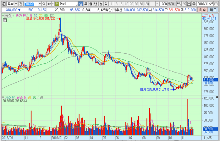 농심의 주가는 25일 종가 31만8000원으로 올해 1월 22일의 고점 54만원에 비해 41.1% 하락한 수준에서 거래되고 있다.
