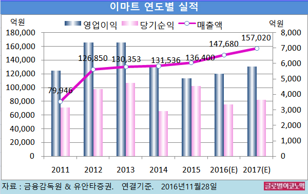 유안타증권 김태홍 연구원은 “오프라인 대형마트에 대한 중장기적 전망은 여전히 부정적이며 지난 4~5년간 기존점 매출 성장 회복세가 지속적으로 이어진 적이 없다”면서 “그러나 이마트의 경우 적어도 올해의 마무리는 기분 좋게 할 수 있을 것”이라고 전망했다.