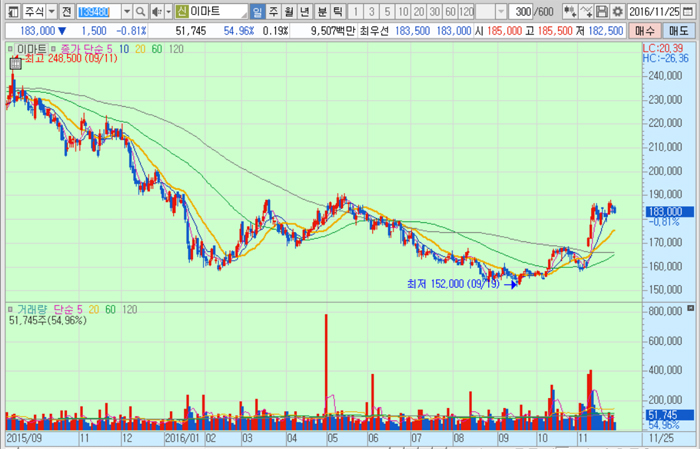 이마트의 주가는 25일 종가 18만3000원으로 올해 9월 19일의 저점 15만2000원에 비해 20.4% 오른 수준에서 거래되고 있다.