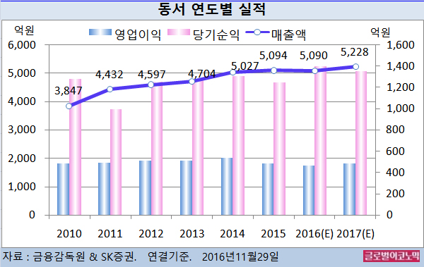 이어 2017년 동서의 연결기준 매출액이 5228억원(전년비 +2.7%), 영업이익 482억원(전년비 +4.1%), 당기순이익 1353억원(전년비 -3.1%)에 이를 것으로 전망하고 있다.