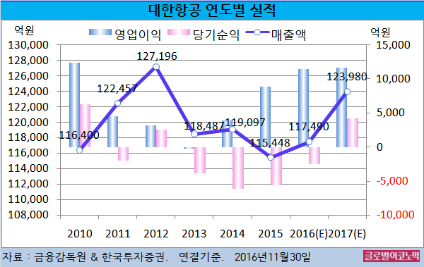 윤 연구원은 “이는 자회사인 한진해운 때문”이라며 “결과적으로 대한항공은 한진해운과 관련해 8251억원의 손실을 인식해 올해 순손실을 기록할 것”이라고 전망했다.