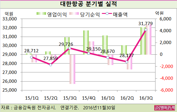 대한항공은 2014년 12월부터 유가가 폭락하자 이익이 빠르게 늘어나며 부채비율이 큰 폭으로 하락할 것으로 예상됐으나 한진해운 관련 손실로 인해 오히려 부채비율이 높아졌다.