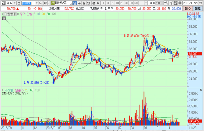 대한항공의 주가는 29일 종가 3만700원으로 올해 9월 29일의 고점 3만5800원에 비해 14.2% 하락한 수준에서 거래되고 있다.