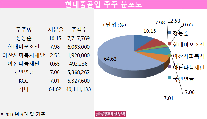 현대중공업의 주주분포는 정몽준 아산재단 이사장의 지분을 포함한 특수관계인의 지분이 비교적 낮은 편이다. 이들 특수관계인의 지분은 21.34%(1622만1082주)에 불과하다.